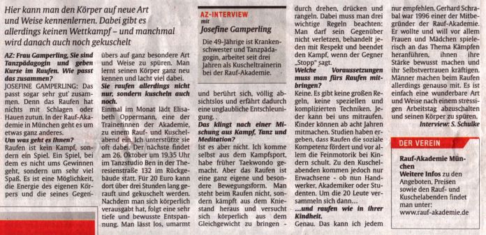 AZ: Frau Gamperling, Sie sind Tanzpädagogin und geben Kurse im Raufen. Wie passt das zusammen? JOSEFINE GAMPERLING: Das passt sogar sehr gut zusammen. Denn das Raufen hat nichts mit Schlagen oder Hauen zu tun. In der Rauf-Akademie in München geht es um etwas ganz anderes. Um was geht es Ihnen? Raufen ist kein Kampf, sondern ein Spiel. Ein Spiel, bei dem es nicht um Gewinnen geht, sondern um sehr viel Spaß. Es ist eine Möglichkeit, die Energie des eigenen Körpers und die seines Gegenübers auf ganz besondere Art und Weise zu spüren. Man lernt seinen Körper ganz neu kennen und lacht viel dabei. Das ist genauso, als ob Kinder raufen würden. Sie raufen allerdings nicht nur, sondern kuscheln auch noch. Wie kann man sich das vorstellen? Einmal im Monat lädt Elisabeth Oppermann, eine der Trainerinnen der Akademie, zu einem Rauf- und Kuschelabend ein. Ich unterstütze sie oft dabei. Der nächste findet am 26. Oktober um 19.35 Uhr im Tanzstudio Ben in der Theresienstraße 132 im Rückgebäude statt. Für 20 Euro kann dort über drei Stunden lang gerauft und gekuschelt werden. Nachdem man sich körperlich verausgabt hat, folgt eine sehr tiefe und bewusste Entspannung. Man lässt los, umarmt und berührt sich, völlig absichtslos und erfährt dadurch eine unglaubliche Entschleunigung. Man befreit sich von dem alltäglichen Stress, Druck und Lärm, lässt seinen Körper sprechen und zur Ruhe kommen. Das klingt nach einer Mischung aus Kampf, Tanz und Meditation? Ist es aber nicht. Ich komme selbst aus dem Kampfsport, habe früher Taekwondo gemacht. Aber das Raufen ist eine ganz eigene und besondere Bewegungsform. Man steht beim Raufen nicht, sondern kämpft aus dem Kniestand heraus und versucht sich körperlich aus dem Gleichgewicht zu bringen – durch drehen, drücken und rangeln. Dabei muss man drei wichtige Regeln beachten: Man achtet darauf, dass man sein Gegenüber nicht verletzt, außerdem mit Respekt behandelt und den Kampf beendet, wenn der Gegner „Stopp“ sagt. Bieten Sie auch noch andere Rauf- und Kuschelabende an? Wir haben leider keine eigenen Räumlichkeiten. Aber man braucht zum Raufen nicht viel. Im Sommer kann man sich einfach auf einer schönen, bunten Wiese treffen. Im Winter ist ein Dach über dem Kopf natürlich sehr wichtig – in Form eines Raumes, in dem man sich frei bewegen kann oder einer Sporthalle. Da sind wir sehr flexibel und mobil. Wir geben auch Rauf-Kurse für Gruppen, Vereine und an Schulen. Welche Voraussetzungen muss man fürs Raufen mitbringen? Keine. Es gibt keine großen Regeln, keine speziellen und komplizierten Techniken. Jeder kann bei uns mitraufen. Kinder können ab acht Jahren mitmachen. Studien haben ergeben, das Raufen die soziale Kompetenz fördert und vor allem die Feinmotorik bei Kindern schult. Zu den Kuschelabenden kommen jedoch nur Erwachsene - ob nun Handwerker, Akademiker oder Studenten. Um die 20 Leute versammeln sich dann… …und raufen wie die Kinder. Genau. Das kann ich jedem nur empfehlen. Gerhard Schrabal war 1996 einer der Mitbegründer der Rauf-Akademie. Er wollte und will vor allem Frauen und Mädchen spielerisch an das Thema Kämpfen heranführen, ihnen ihre Stärke bewusst machen und ihr Selbstvertrauen kräftigen. Männer machen beim Raufen allerdings genauso mit. Es ist einfach eine wunderbare Art und Weise nach einem stressigen Arbeitstag abzuschalten und seinen Körper zu spüren. Interview: Sebastian Schulke |