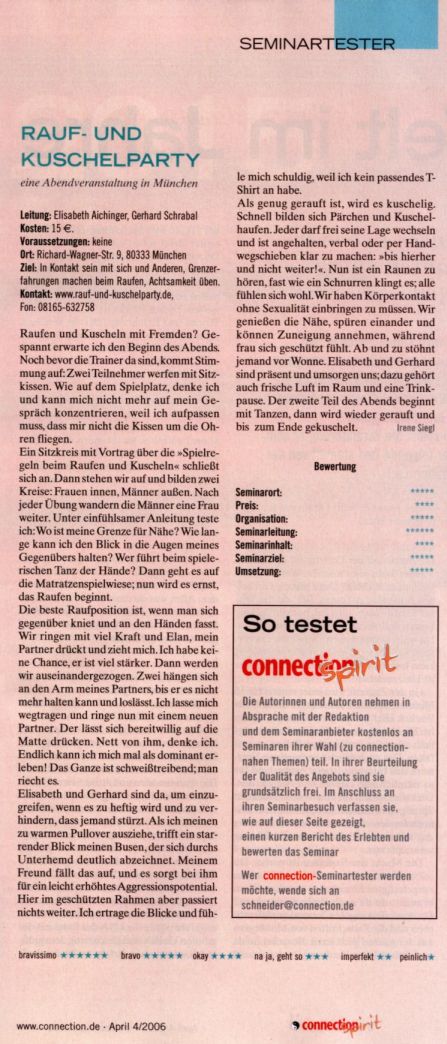 Der Bericht lautet: Raufen und Kuscheln mit Fremden? Gespannt erwarte ich den Beginn des Abends. Noch vor Anwesenheit der Trainer/innen kommt bereits Stimmung auf. Zwei Teilnehmer werfen mit Sitzkissen. Wie auf dem Spielplatz, denke ich und kann mich nicht mehr auf mein Gespräch konzentrieren, weil ich aufpassen muss, dass mir nicht die Kissen um die Ohren fliegen. Ein Sitzkreis mit Vortrag über die „Spielregeln beim Raufen und Kuscheln" schließt sich an. Dann stehen wir auf und bilden 2 Kreise. Frauen innen, Männern außen. Nach jeder Übung wandern die Männer eine Frau weiter. Unter sehr einfühlsamer Anleitung teste ich: Wo ist meine Grenze für Nähe? Wie lange kann ich den Blick in die Augen meines Gegenübers aushalten? Wer führt beim spielerischen Tanz der Hände? Dann geht es auf die Matratzenspielwiese; nun wird es ernst, das Raufen beginnt. Die beste Raufposition ist, sich gegenüber kniend und an den Händen fassend. Wir ringen mit viel Kraft und Elan, mein Partner drückt und zieht mich. Ich habe keine Chance, weil er viel stärker ist. Dann werden wir auseinandergezogen. Zwei hängen sich an den Arm meines Partners bis er nicht mehr halten kann und loslässt. Ich lasse mich wegtragen und ringe nun mit neuem Partner. Der lässt sich bereitwillig auf die Matte drücken. Nett von ihm, denke ich. Endlich kann ich mich mal als dominant erleben. Das Ganze ist schweißtreibend; man riecht es. Elisabeth und Gerhard sind da, um einzugreifen, wenn es zu heftig wird und zu verhindern, dass jemand stürzt. Als ich meinen zu warmen Pullover ausziehe, trifft ein starrender Blick meinen Busen, der sich durchs Unterhemd deutlich abzeichnet. Meinem Freund fällt das auf und es sorgt bei ihm für ein leicht erhöhtes Aggressionspotential. Hier im geschützten Rahmen aber passiert nichts weiter. Ich ertrage die Blicke und fühle mich schuldig, weil ich kein passendes T-Shirt an habe. Als genug gerauft ist, wird es kuschelig. Schnell bilden sich Pärchen und Kuschelhaufen. Jeder darf frei seine Lage wechseln und ist angehalten, verbal oder per Handwegschieben klar zu machen „bis hierher und nicht weiter!". Nun ist ein Raunen zu hören, fast wie ein Schnurren klingt es; alle fühlen sich wohl. Wir haben Körperkontakt ohne Sexualität einbringen zu müssen. Wir genießen die Nähe, spüren einander und können Zuneigung annehmen, während frau sich geschützt fühlt. Ab und zu stöhnt jemand vor Wonne. Elisabeth und Gerhard sind präsent und umsorgen uns; dazu gehört auch frische Luft im Raum und eine Trinkpause. Der zweite Teil des Abend beginnt mit Tanzen, danach wird wieder gerauft und bis zum Ende gekuschelt. Irene Siegl