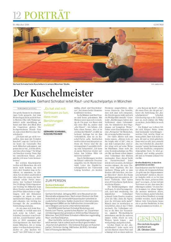 Der KuschelmeisterGroßer Artikel in der GESUND vom 19.10.14Die GESUND erschien seinerzeit 14-tägig als Beilage verschiedener großer Tageszeitungen (Berliner Morgenpost, Hamburger Abendblatt, Hannoversche Allgemeine, Neue Presse, Leipziger Volkszeitung, Dresdner Neueste Nachrichten) sowie der Welt am Sonntag. Die Gesamt-Auflage betrug ca. 1,1 Millionen. Inhaltlich ging es um Medizin, Ernährung, Fitness und Wohlbefinden.