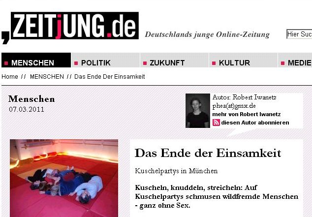 Das Ende der EinsamkeitKuschelpartys in MünchenKuscheln, knuddeln, streicheln: Auf Kuschelpartys schmusen wildfremde Menschen - ganz ohne Sex.Stell dir vor: Du wirst ertastet. Fremde Finger erkunden deinen Körper. Und du tastest selbst. Zaghaft streichelst du Hände, Zehen; wirst mutiger, berühst Rücken, Bäuche und Köpfe. Der Schauer setzt ein. Das Verlangen nach Berührung wird stärker, ein angenehmes Gefühl breitet sich aus. Wie du bereits weisst, bist du nicht allein. Um dich herum liegen 25 Menschen auf gelben, orangen und roséfarbenen Turnmatten. Sie alle sind engumschlungen. Das Licht ist gedämpft, nur ein paar LED-Ketten leuchten. Die Stimmung ist wohlig und schlaftrunken. Ein Mann stöhnt, es klingt nach Genugtuung. Keine Szene aus "Die 120 Tage von Sodom" Keine Angst: Du bist nicht Teil einer Szene aus Pier Paolo Pasolinis „Die 120 Tage von Sodom“. Du bist in einem Tanzstudio mit Dielenboden und einer verspiegelten Wand. Normalerweise lernen Kinder und Erwachsene hier Jazz- und Showtänze, aber an diesem Freitagabend liegen die Dinge ein bisschen anders. Eine der Teilnehmerinnen, sie heißt Annika, erzählt: „Eigentlich wollte ich auf ein Tantraseminar.“ Und so ähnlich dürften auch deine Gedanken im Moment sein, oder? Annika, 26, sieht ein bisschen aus wie Kristen Stewart, die Hauptdarstellerin aus den Twilight-Filmen. Sie ist hier, weil sie einen neuen Umgang mit Körperkontakt lernen möchte. Ihr Freund führt eine offene Beziehung, weswegen Annika nun lernen will, sich auf Nähe einzulassen, die nichts mit Beziehungen zu tun hat. Es ist einer der möglichen Gründe, warum Menschen hierherkommen. Die anderen heißen: Neugier, Einsamkeit, möglicher Singletreff, Unverbindlichkeit, Genuss und Zärtlichkeit. Sie alle führen ins Herz des Münchner Szenebezirks Schwabing - auf eine Kuschelparty. Unglücklich übersetzt Bitte, was? Eine Kuschelparty? „Unglücklich übersetzt“, erklärt Kuschelmeister Gerhard, der sonst ähnliche Treffen leitet, heute aber nur Teilnehmer ist. „Aber wie soll man es denn stattdessen nennen?“ Ihren Ursprung hatte die Szene in New York, wo 2004 die erste „Cuddle Party“ stattfand. Bereits ein Jahr später folgten die ersten Veranstaltungen in Berlin und München. Allein in der bayrischen Landeshauptstadt gab es zwischenzeitlich vier Anbieter, bei denen man wahlweise auf Matten und im Wasser kuscheln kann, bei denen gerauft oder getanzt wird. Auch an diesem Abend beginnt die Kuschelparty mit Tanz. Es erklingt Ethno-Musik, die aus dem Auenland stammen könnte, der Heimat der Hobbits, und nach der sich die Teilnehmer bewegen sollen. Das Motto dabei gleicht dem Refrain des Neue Deutsche Welle-Hits „Major Tom“ von Peter Schilling: „Völlig losgelöst, von der Erde.“ Sofort wird deutlich, wer schon öfter hier war und sich dementsprechend gehen lässt, und wer stocksteif dasteht und mit dem eigenen Schamgefühl kämpft. Ralf, einer der männlichen Teilnehmer, verweigert sogar die vollen folgenden 40 Minuten jede Form von Tanzbemühungen. Abwegiges Wellness-Programm Nach dem Tanzen besteht die Aufgabe darin, wahllos vor einem anderen Teilnehmer innezuhalten und ihm ein Kompliment zu machen. Was sagt man da? Hübsches Lächeln, starke Ausstrahlung, tolles Körpergefühl? Viele der Antworten lauten so, sie sind Balsam für den Teil der Seele, der Selbstwertgefühl heißt. Vielleicht soll gerade dieser Part bewusst machen, dass eine Kuschelparty keine „normale“ Party, kein Esoterik-Seminar und kein Swinger-Club-Besuch sein soll, sondern ein Ort der Zufriedenheit - ein etwas abwegiges Wellness-Programm, bei der man keine Reflexzonenmassage bekommt, sondern zusammen einem schamanisches Mantra lauscht und sich etwas wünschen soll. Das Ende der Einsamkeit, zum Beispiel. Vermittlungsquote änlich wie bei anderen Single-Veranstaltungen „Als ich das erste Mal hierherkam, war ich so ausgehungert nach Nähe, dass mir die Tränen kamen“, erzählt die 49-jährige Cornelia. „Doch dann zu spüren: Ich kann noch fühlen - das war überwältigend.“ Heute lebt die Bürokauffrau wieder in einer Beziehung, ihren Freund hat sie auf einer Kuschelparty kennengelernt. Eine Ausnahme ist Cornelia damit nicht, die Vermittlungsquote der Kuschelpartys ist ähnlich hoch wie auf anderen Single-Veranstaltungen, schätzt Kuschelmeister Gerhard. „Der Unterschied ist nur, dass bei uns jeder zufrieden rausgeht.“ Wie viele Singles es in Deutschland gibt, lässt sich nicht exakt beziffern, nur einkreisen. In den letzten Jahren wurden jeweils rund 200.000 Ehen geschieden, und in fast 40 Prozent der Haushalte lebt nur eine Person - Tendenz steigend. Jeder einzelne dieser Menschen sehnt sich nach Zuneigung, doch in unserer Gesellschaft existiert Nähe nur in Kombination mit Beziehungen. „In Deutschland gibt man sich die Hand, oder man geht ins Bett - dazwischen gibt’s nichts!“, so Gerhard, der hauptberuflich als Unternehmensberater tätig ist. „Wir probieren die Lücke dazwischen zu füllen.“ Vorbehalte durch Missbrauchsskandal Doch die Vorbehalte sind groß. „Die typische Antwort auf die Frage, ob man zu einer Kuschelparty gehen würde, lautet: Ich kann mir das nicht vorstellen.“ Kuscheln sei für die meisten das, was vor und nach dem Sex passiere, sagt der 51-jährige. „Die Leute reden sich ein: ‚Das hab ich nicht nötig‘ und belügen sich selbst damit.“ Doch neben den persönlichen, gibt es auch gesellschaftliche Vorbehalte. Nach den Missbrauchsskandalen am Berliner Canisius-Kolleg und der Odenwaldschule hat das Thema Nähe eine neue Brisanz bekommen. Gerhard, der neben den Kuschelpartys auch „Raufen für Kinder“ veranstaltet, spürt das immer öfter. „Neulich wollte mich vor dem Raufen ein sechsjähriges Mädchen umarmen, weil sie sich freute, mich zu sehen. Und was macht der Sozialarbeiter der Einrichtung? Ermahnt sie sofort: ‚Du darfst nicht auf fremde Männer zugehen‘“. 20 Euro Teilnahmegebühr Bereits im 
